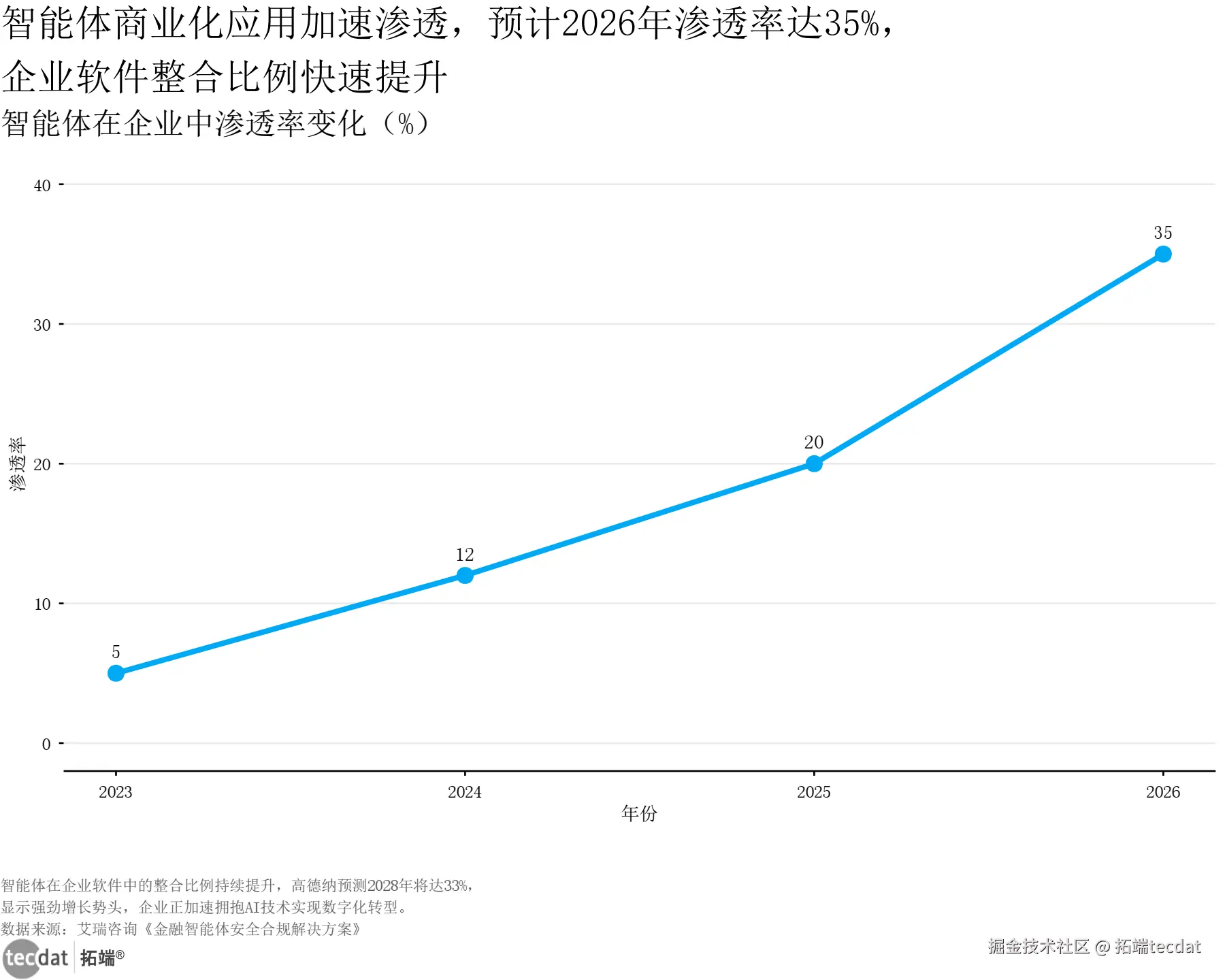 智能体在企业软件中的整合比例持续提升,高德纳预测2028年将达33%,显示强劲增长势头,企业正加速拥抱AI技术实现数字化转型,商业化进入快车道。