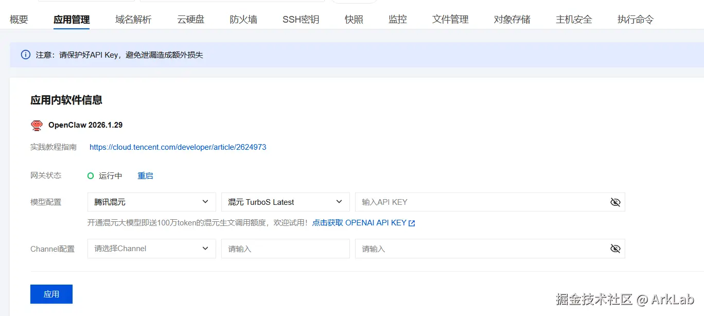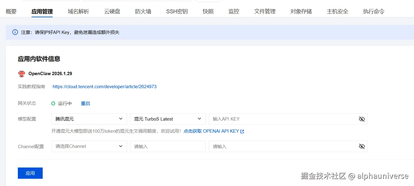 腾讯轻量云主机上安装openclaw的确很方便,只要选择号应用模板,安装后控制台就可以设置接入渠道核模型配置。