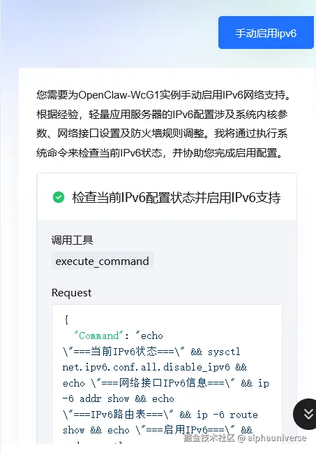 就这么简单!如果报错或者系统内核参数没有开启ipv6, openclaw没有权限修改内核参数的话,到腾讯云轻量控制台,通过 AI助手输入“手动开启 IPv6”, 然后会提示授权执行,确认后就会配置好 IPv6参数。重新让openclaw 使用默认网关使用 fe80::feee:ffff:feff:ffff 配置即可。