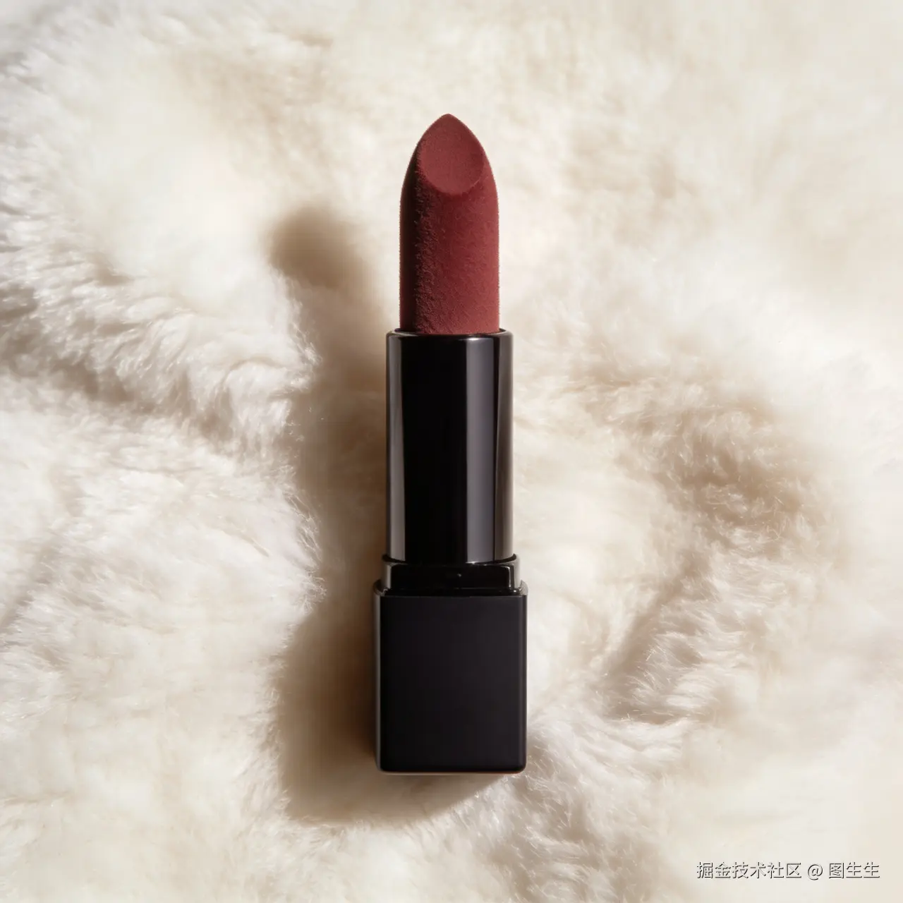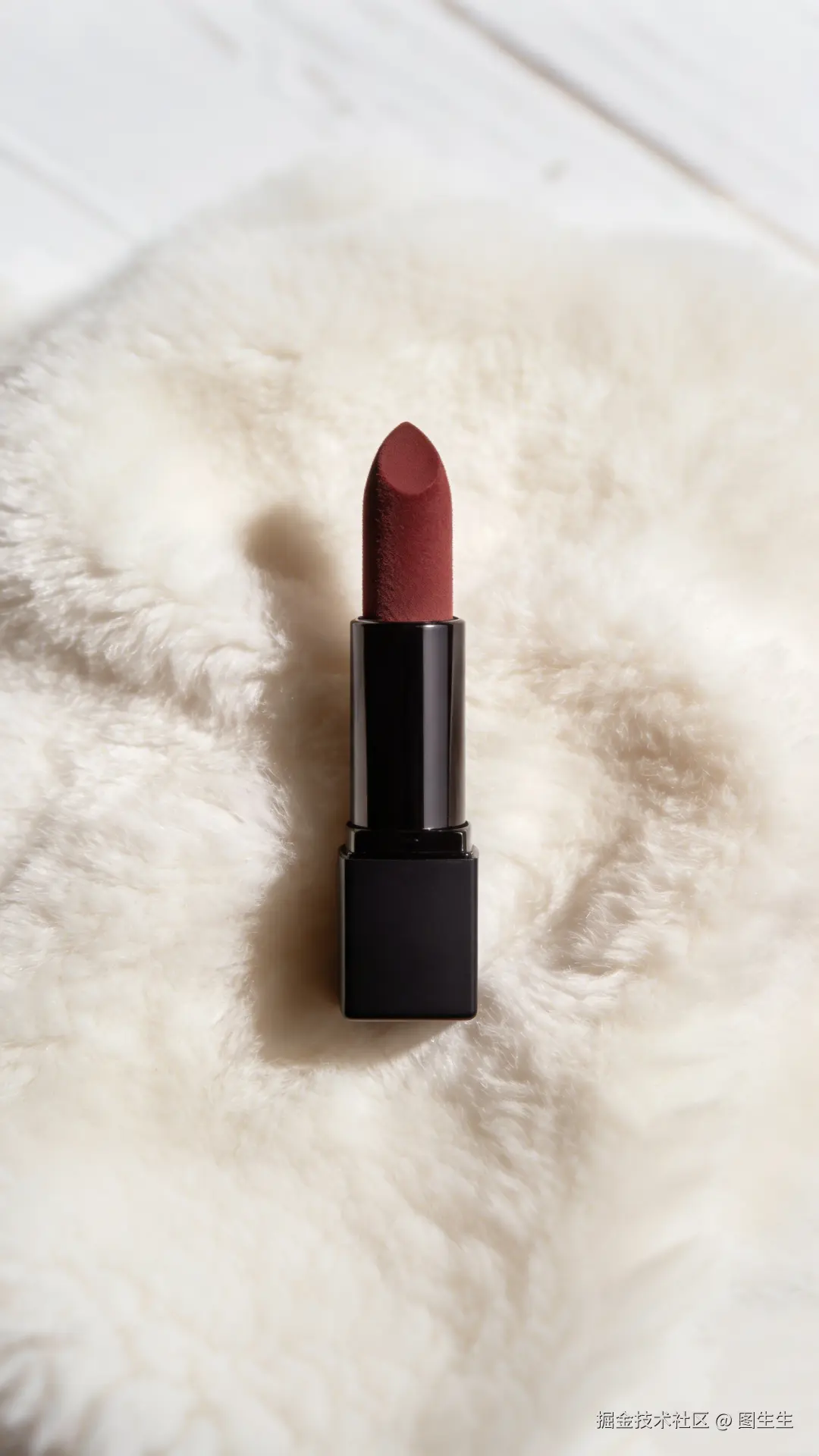 ◇原图:一支哑光口红的产品图(比例1:1,膏体是丝绒质地,背景是细腻的米白色绒布)