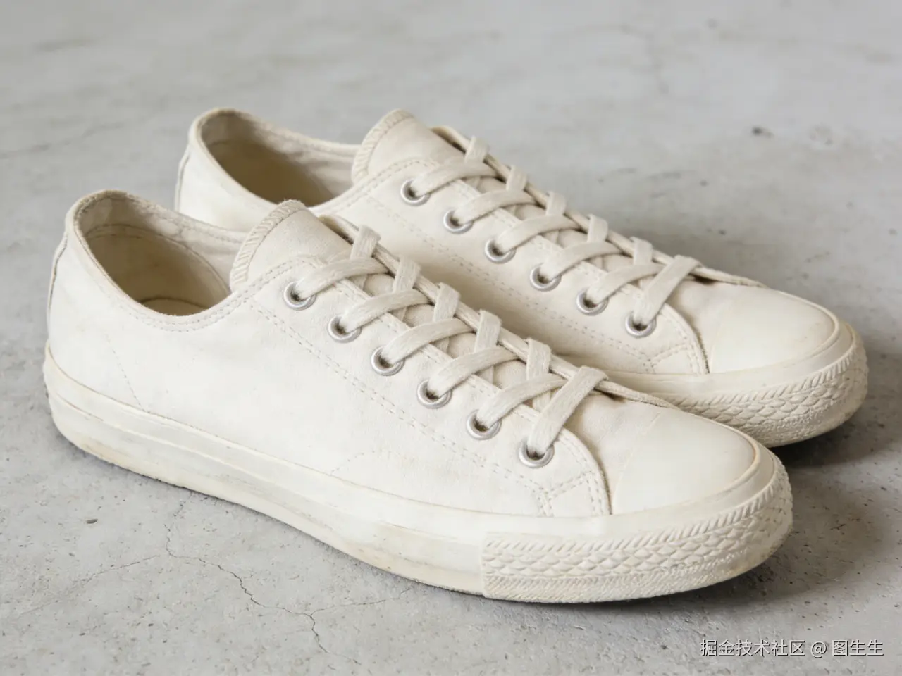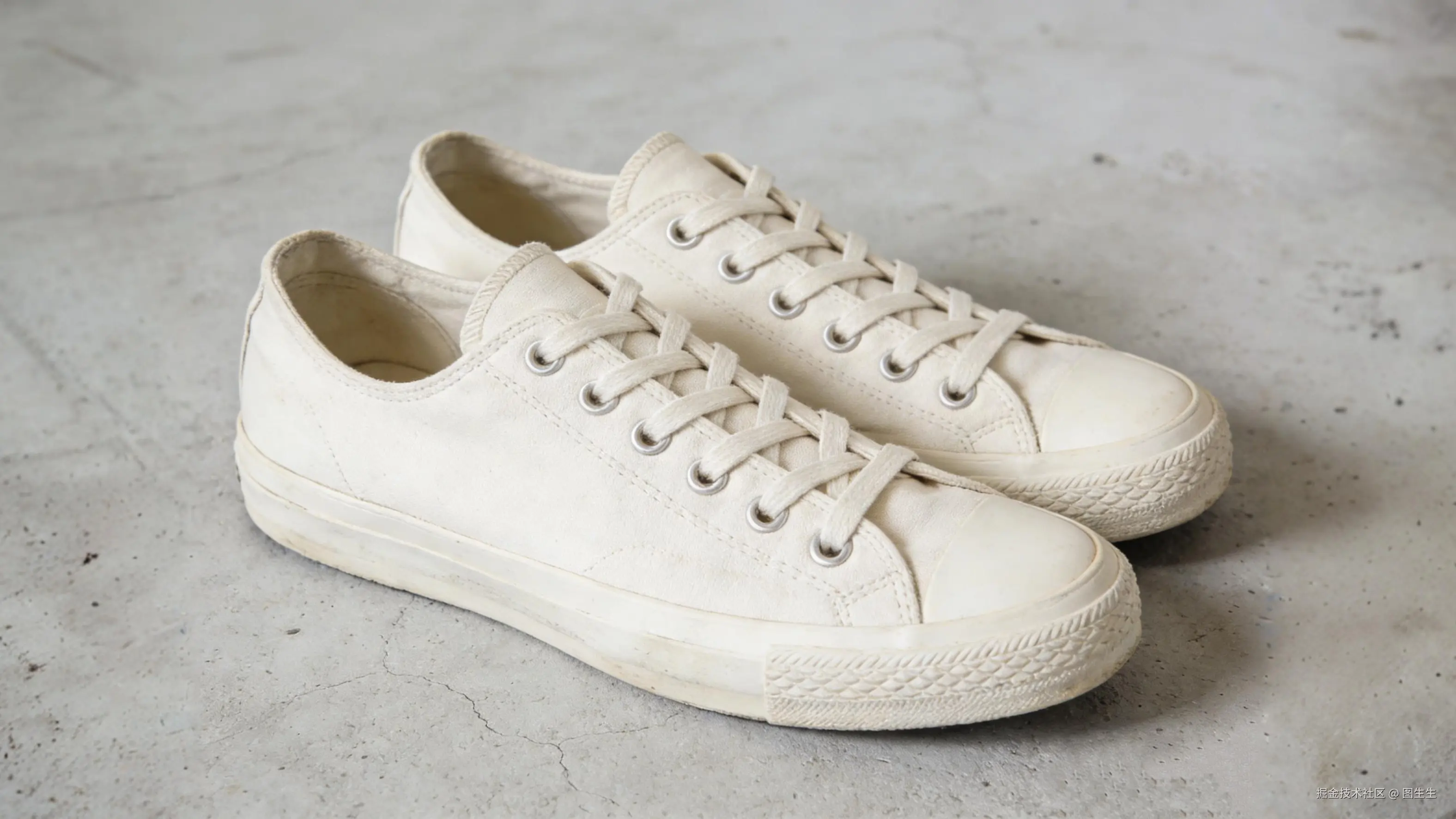 ◇原图: 一双复古小白鞋的4:3棚拍图,鞋身是米白色,背景是干净的浅灰色水泥地面