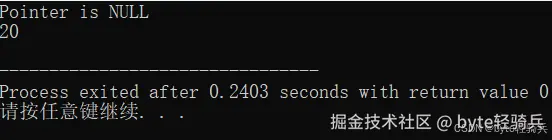 空指针(NULL 或 0)不指向任何有效的内存地址。在将指针用作参数或返回值之前,检查它是否为空是一个好习惯。