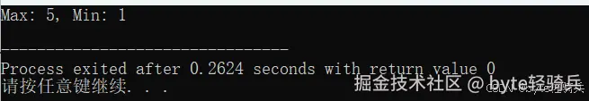 printf("Max: %d, Min: %d\n", max, min); // 输出:Max: 5, Min: 1