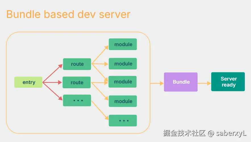 前一张图是传统构建工具的打包构建流程图,它们在启动项目时采用的策略是对项目代码和其依赖进行全量打包后再启动服务。
