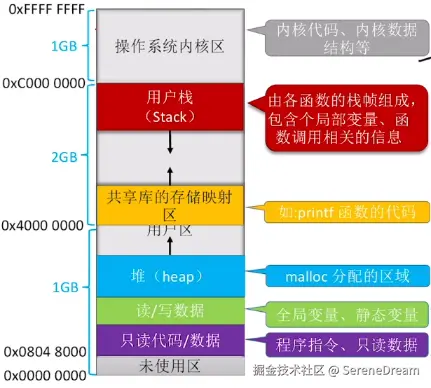 注:无论是栈还是堆,他们都是在进程内存上的一部分,CPU 给进程分配的用户空间是有限的,不加以注意可能会导致栈溢出或者堆溢出
