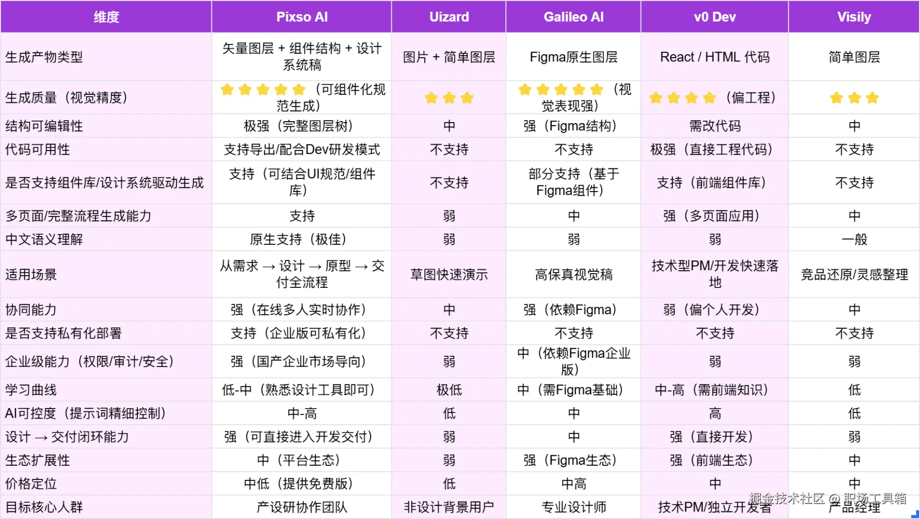 为了方便大家选择到合适的AI产品设计工具,我们整理了以下详细的多维度对比表: