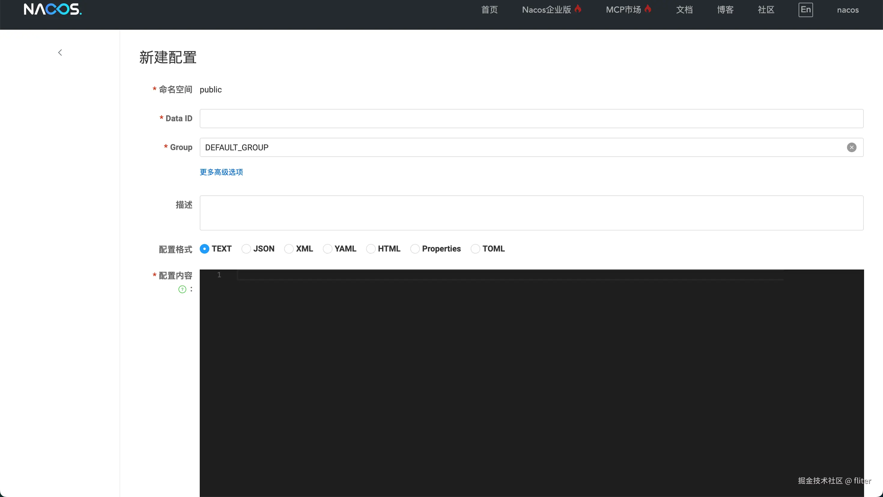 登录后,会看到 Nacos 控制台 左侧菜单有以下几个主要模块: