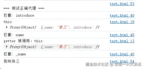 console.log('this', this); // 输出:this Proxy(Object) { _name: '张三' }(即 goodProxy) return `我叫${this.name}`; // 关键:读取 this.name → goodProxy.name -