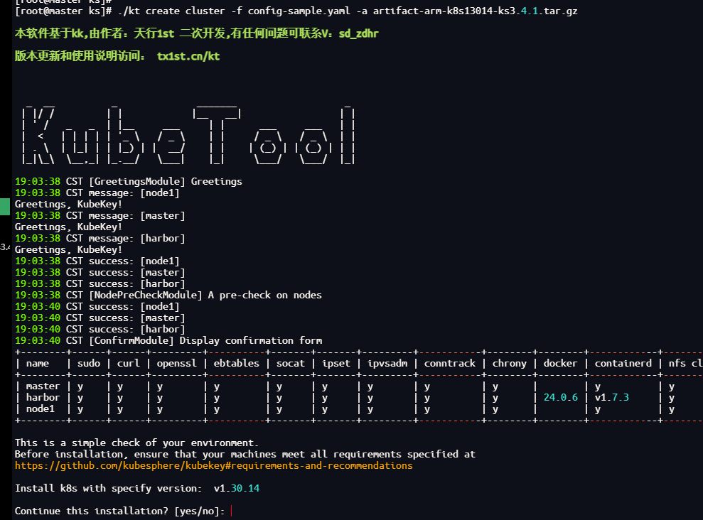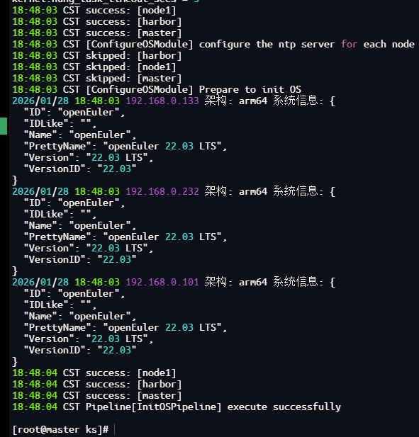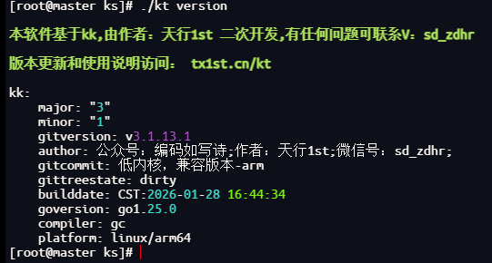 该命令kt会根据配置文件自动判断操作系统和架构以完成所有节点的初始化配置和依赖安装。