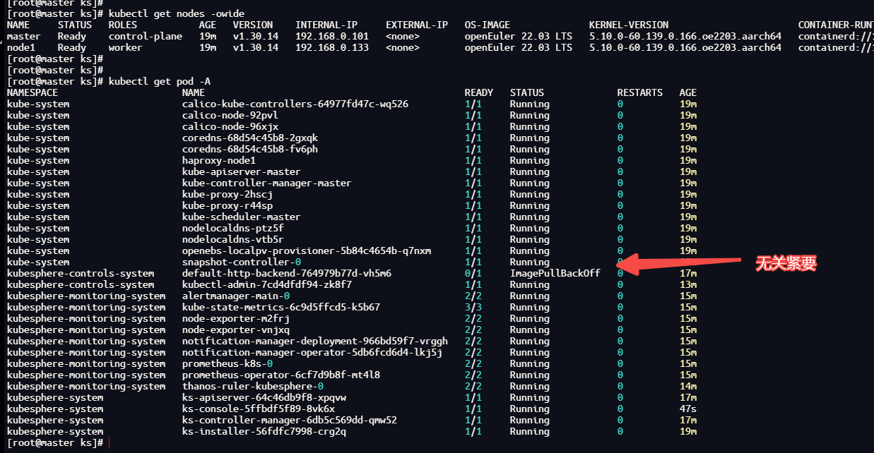 继续等待一段时间,可以看到在内核3.10.0上面使用containerd成功部署了1.30.14版本+ks