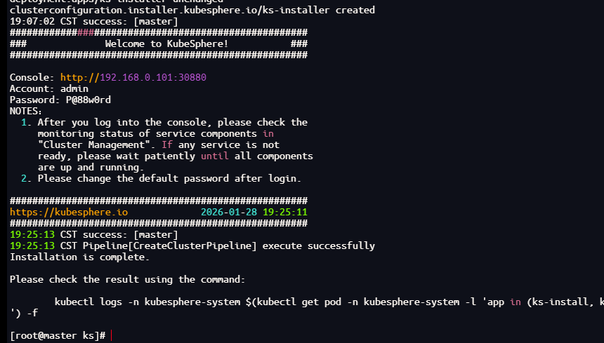 kubectl logs -n kubesphere-system $(kubectl get pod -n kubesphere-system -l 'app in (ks-install, ks-installer)' -o jsonpath='{.items[0].metadata.name}') -f