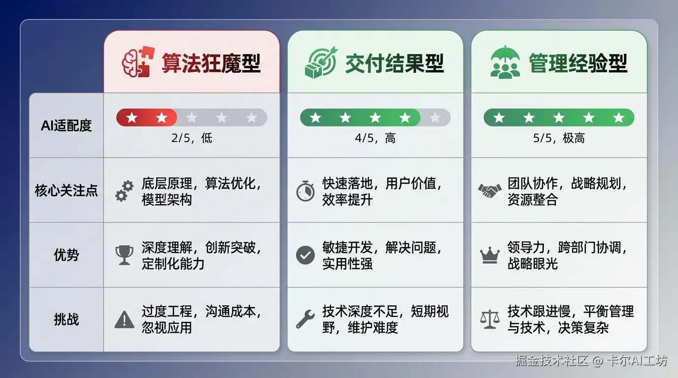道理不难理解:如果你最享受的是Leetcode式的解题快感,那AI时代会让你很痛苦——你不再需要亲手推导动态规划、手写红黑树,AI几秒钟就搞定了。那种"我亲手攻克难题"的成就感,被彻底剥夺了。