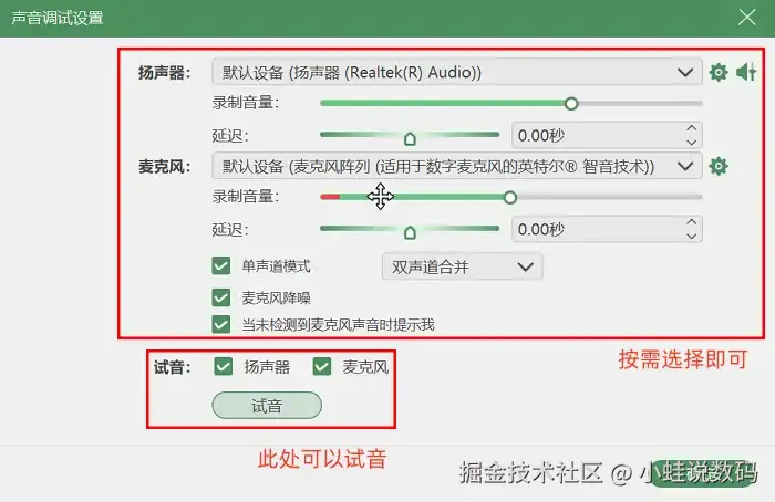进入后续页面,点击右上角 【设置】-【录制设置】-【声音】 ,进入完整音频调试界面,调试完成返回,选定录制屏幕范围后点击 【开始录制】 ;