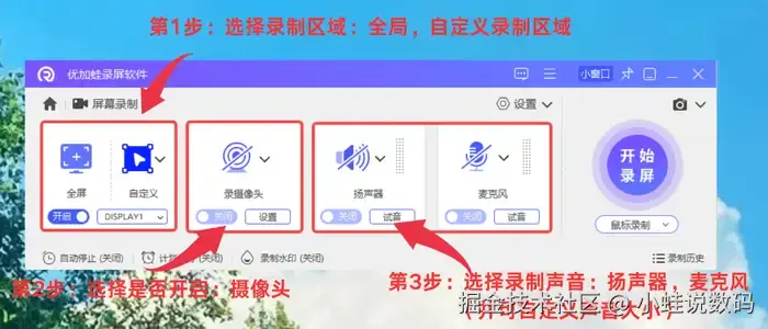 哪个录制软件可以录制内部声音?优加蛙录屏软件支持Windows 7/8/10/11(32位/64位)和macOS 10.15+系统,适配各类电脑配置,包括老旧设备。软件提供7种录制模式:全屏、区域、游戏、摄像头、窗口、围绕鼠标和计划任务。游戏模式具备智能抠图功能,可精准分离人物与背景,效果优于传统绿幕;计划任务模式允许预设录制时间,如自动启动凌晨会议录制,省去手动操作。录制过程中,支持聚光灯、激光笔、鼠标高亮和序号标记等实时标注,便于教学演示。