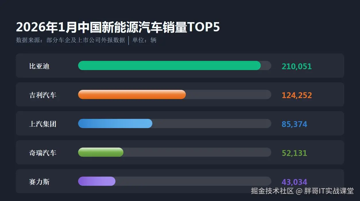 当2026年1月的新能源汽车销量榜单出炉,比亚迪再次用210051辆的佳绩惊艳市场——这已是它连续56个月稳坐新能源汽车销冠宝座,自2021年6月起,榜首之位从未易主。其领先优势显著,将第二名吉利远远甩开近70%,“销冠”已然成为比亚迪的专属代名词。