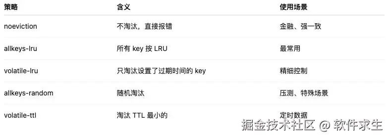 Redis 并不是只有一种 LRU,而是一大家族。常见策略一览表如下表所示: