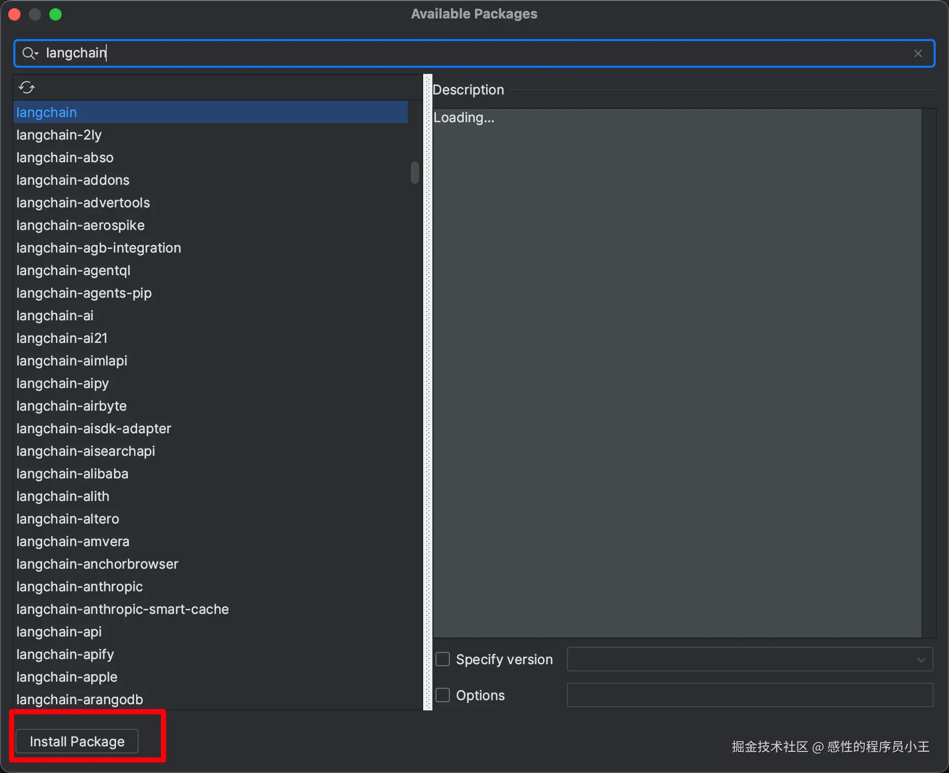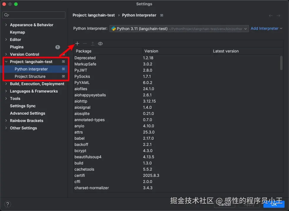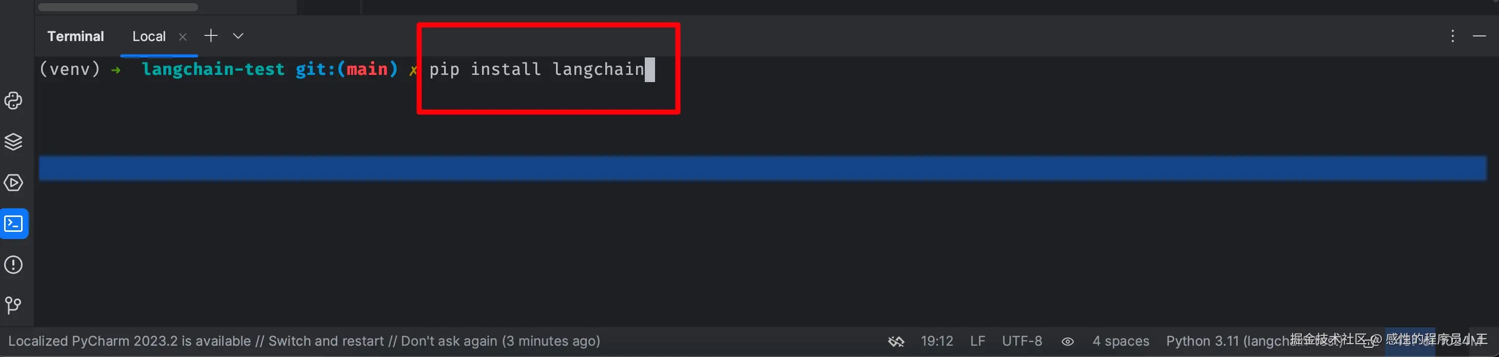 - 使用pip命令安装 进入到已经创建完毕的项目的终端,输入pip install langchain