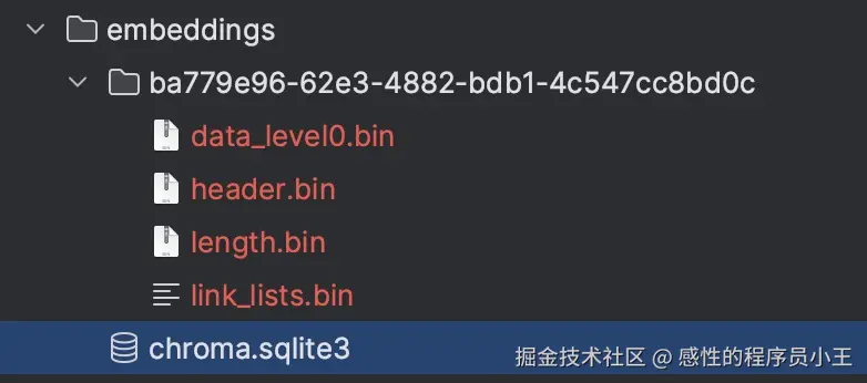 ./embeddings/ ├── chroma.sqlite3 ← 文档内容 + 元数据 + ID └── index/ ← 向量索引文件(二进制,不可读) ├── header.bin ├── data.bin └── ...