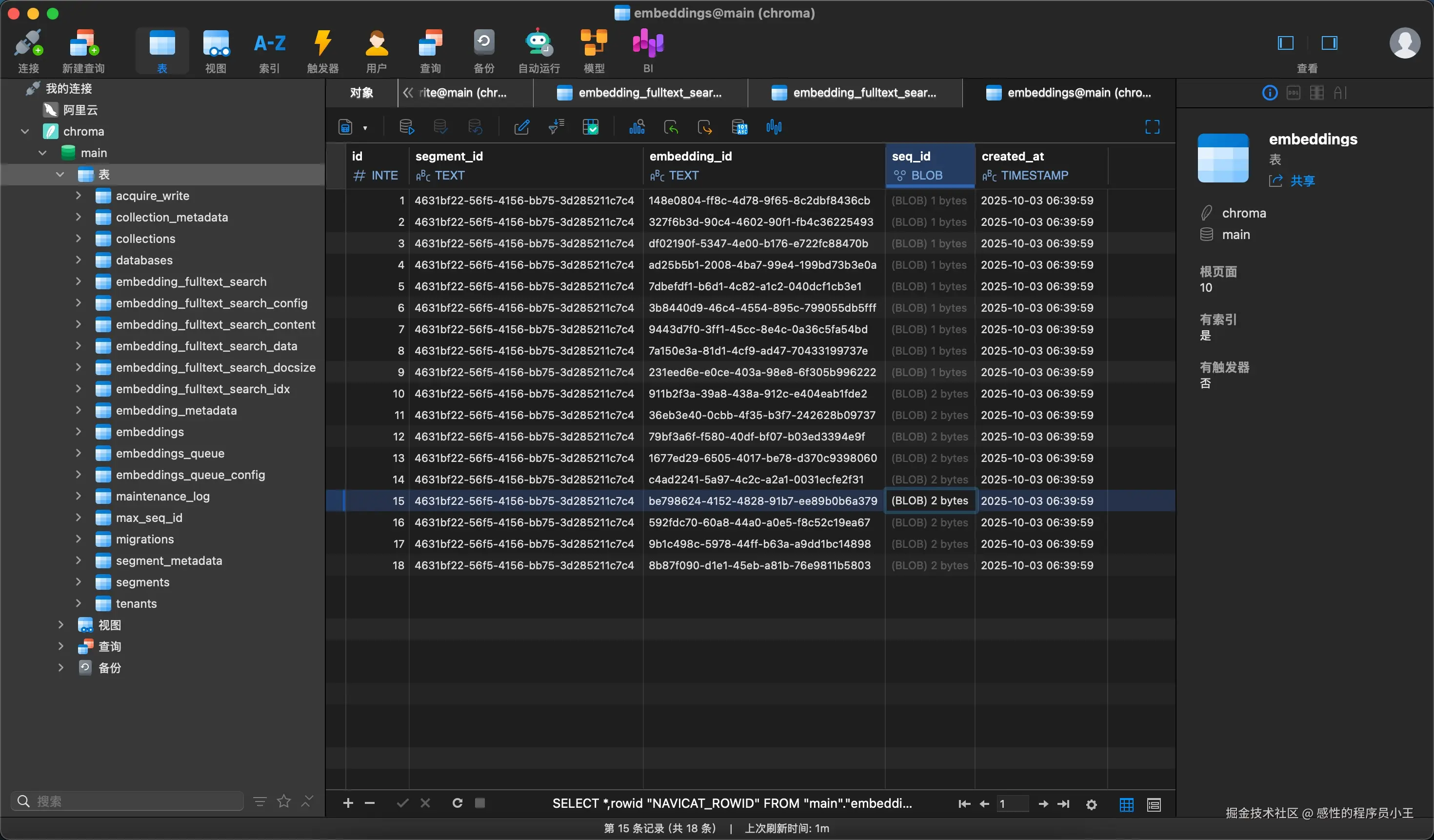 🔍 你可以用 DB Browser for SQLite 打开 chroma.sqlite3,查看 embeddings 表(实际存的是 ID 和文档,不是向量值),向量只存在于索引中。