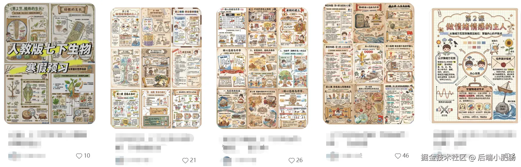 最近在深挖小红书虚拟资料时,我发现了一个知识科普卡片赛道,不管是初中生物图解还是亲子游戏卡,热度都非常高。我特意截取了几个典型的笔记(如下图),这类内容的特点是 信息密度大、排版精美、有一种手绘手账的亲切感。