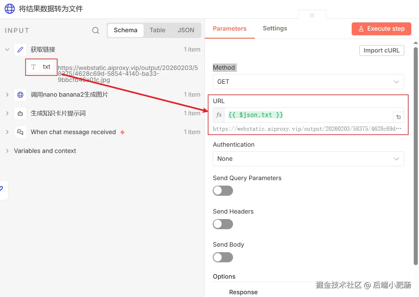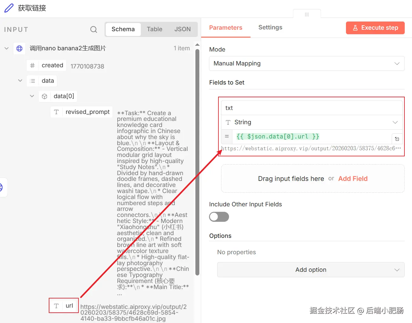 点击【Execute step】运行节点,可以看到左侧取出了图片链接地址。