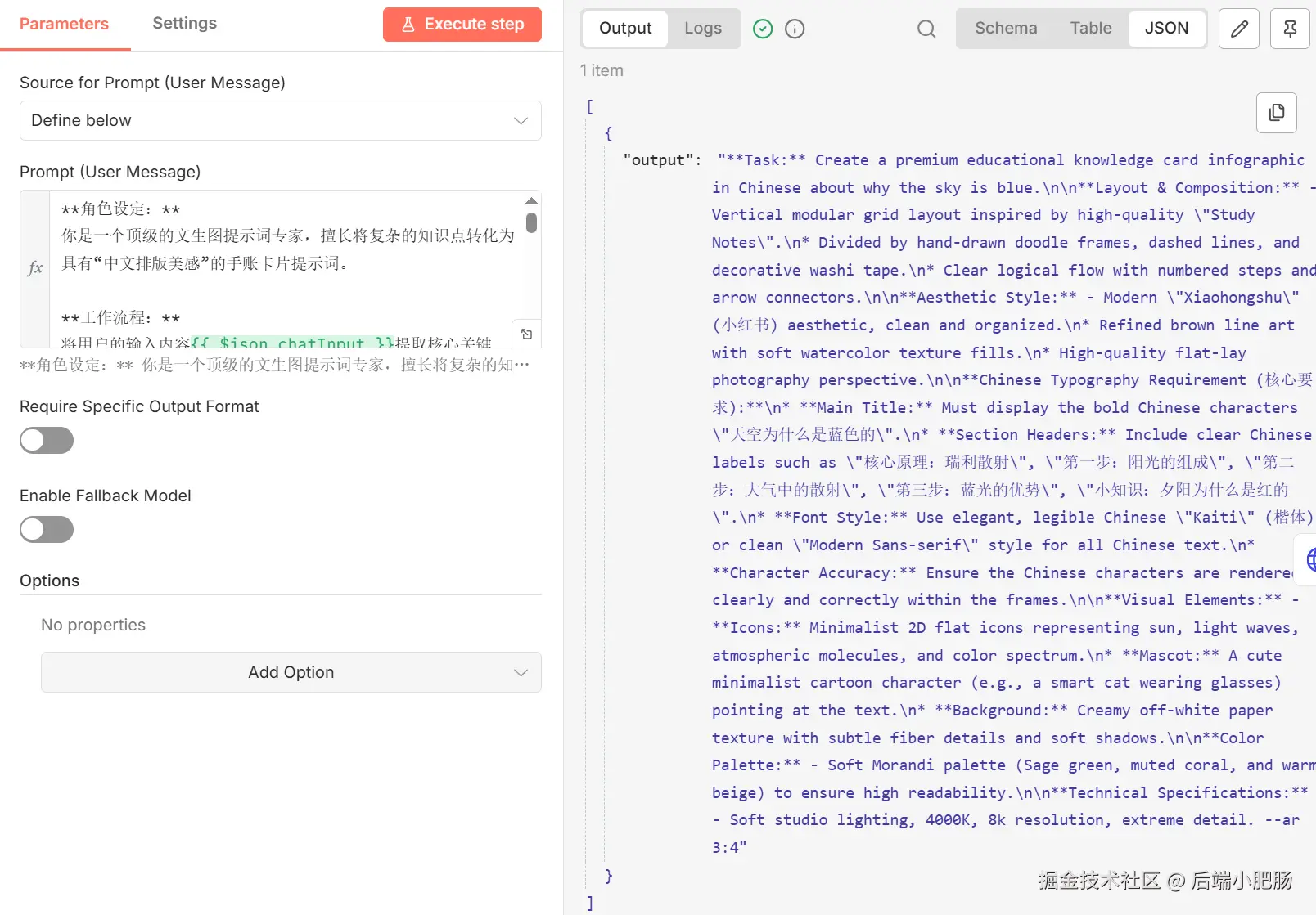 点击【Execute step】运行节点,可以看到左侧输出了知识卡片的文生图提示词。