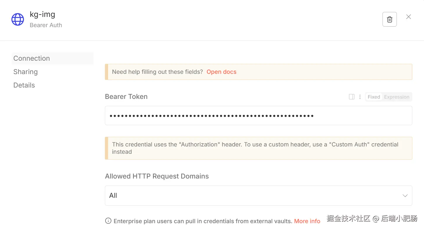 - Bearer Auth处单击【+Create new credential】,在弹出的窗口中输入Bearer Token值,Bearer Token请注册登录kg-api.cloud/后自行获取key后填入…