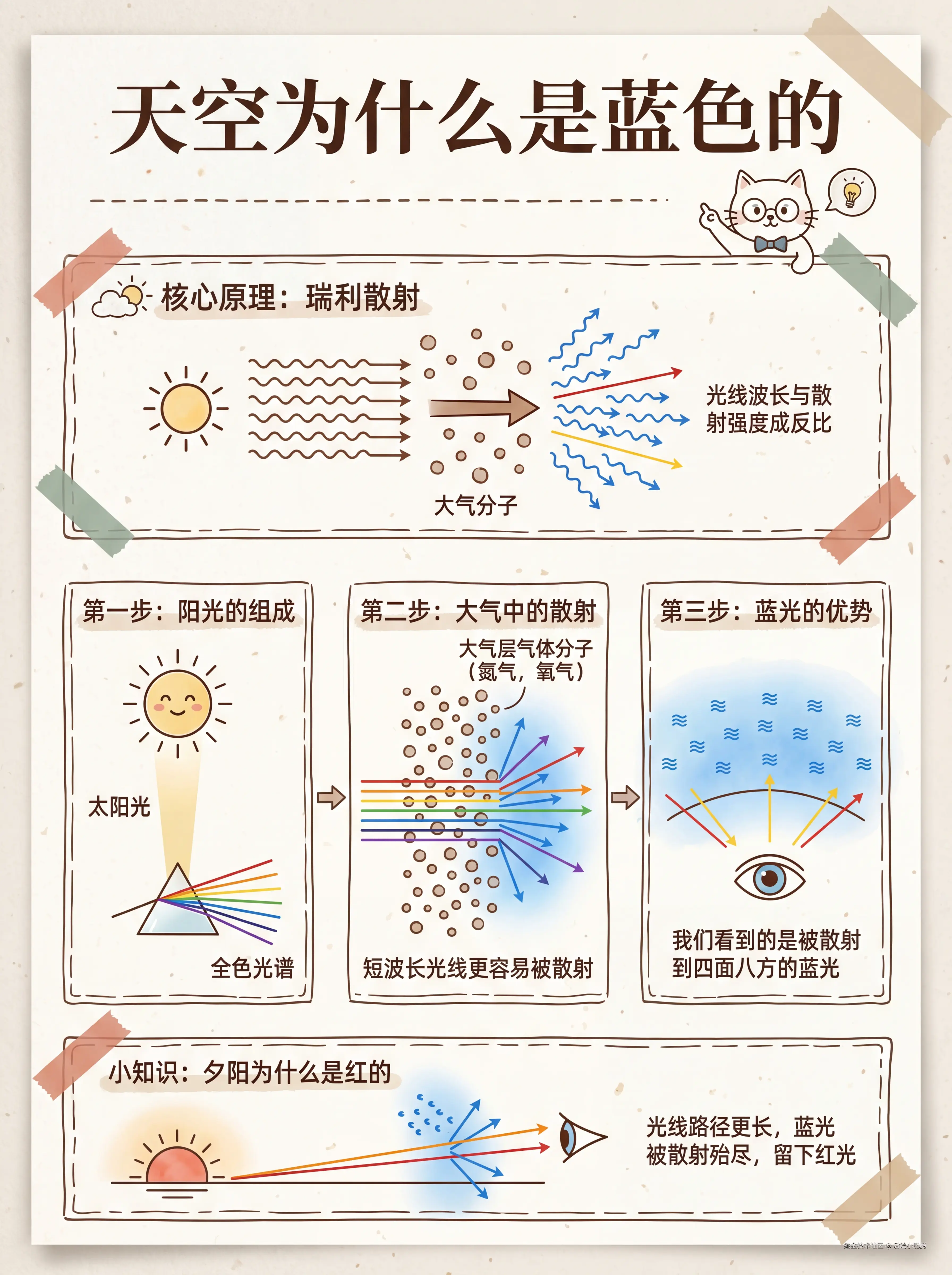 这种内容虽好,但对创作者的门槛主要在于量产,为了解决这一难题,我用 n8n 搓了一个 工作流 : 只需要输入一个知识主题,AI 就会自动提取关键信息,生成 Ins 风/手绘风的图文卡片,并直接将成品生成到本地磁盘。生成效果这边给大家展示一下,一共三张,分别是科普天空为什么是蓝色、光合作用、细胞分裂。