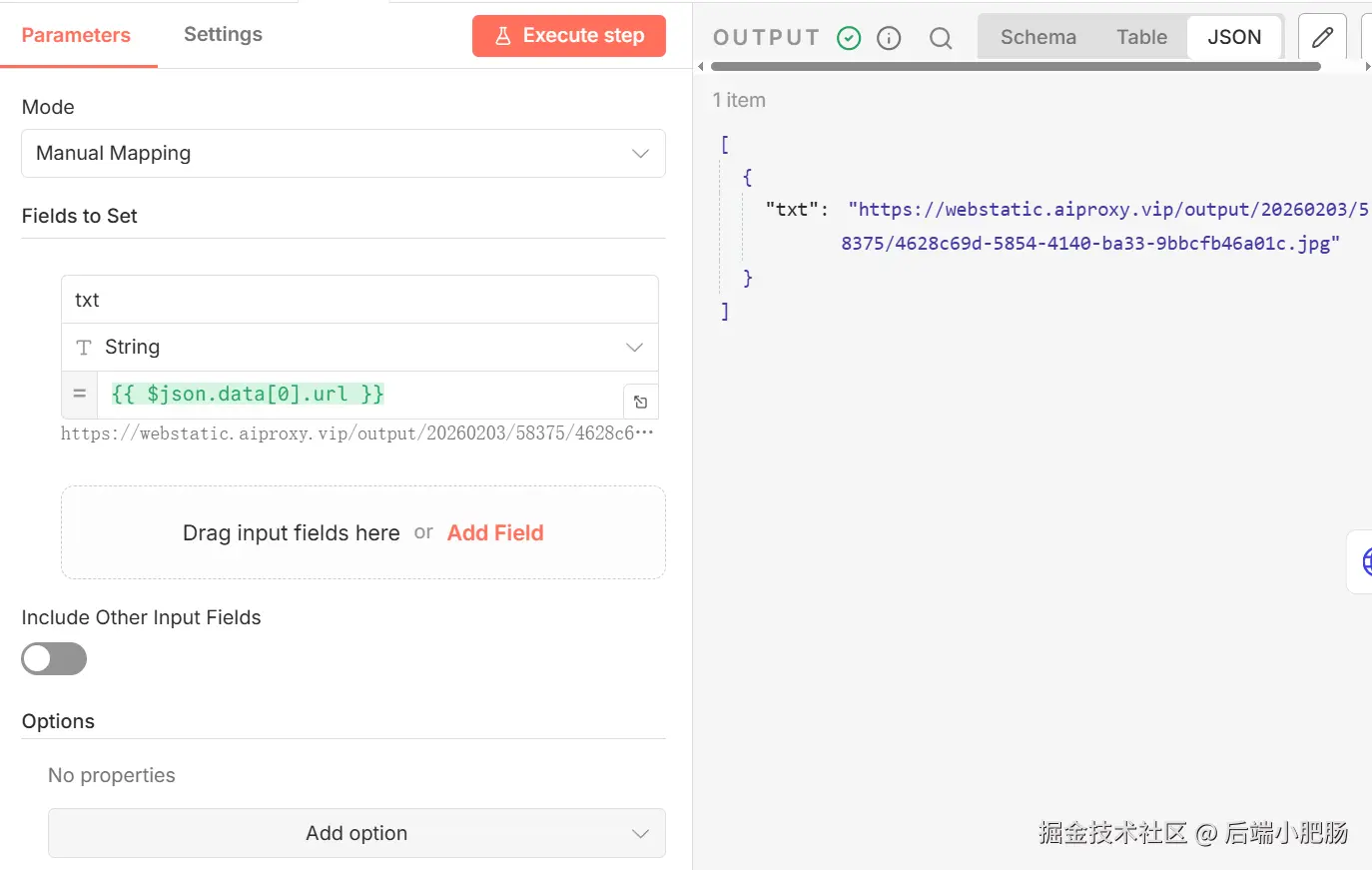 点击【Execute step】运行节点,可以看到左侧输出了图片链接信息(图中的url即为图片链接)。