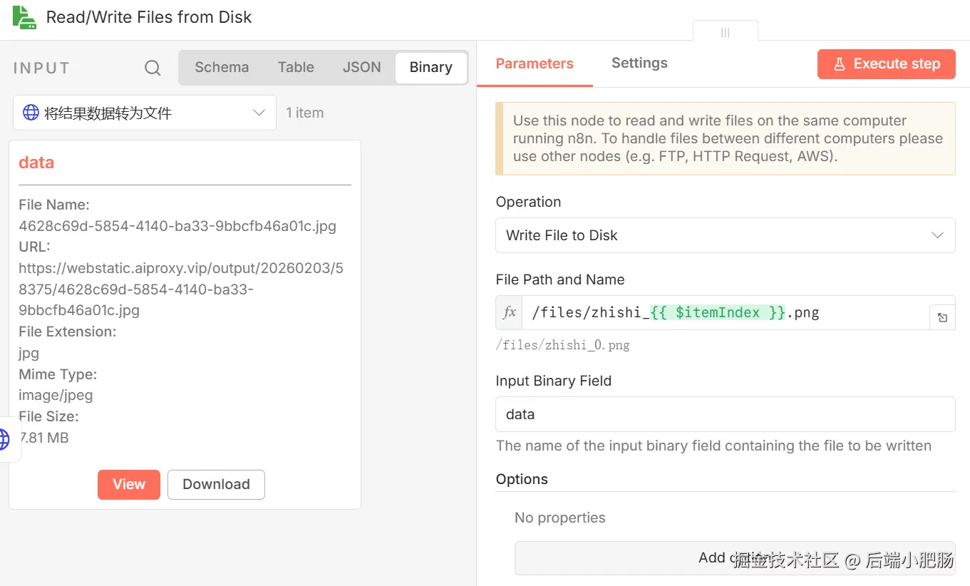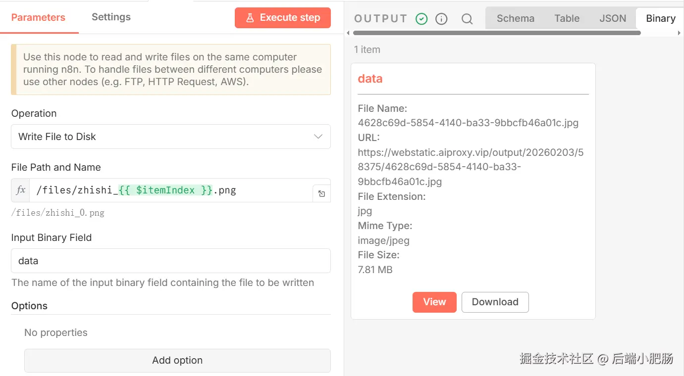 点击【Execute step】运行节点,可以看到左侧取出了图片链接转换为了文件,点击【View】按钮可以看到生成的图片。