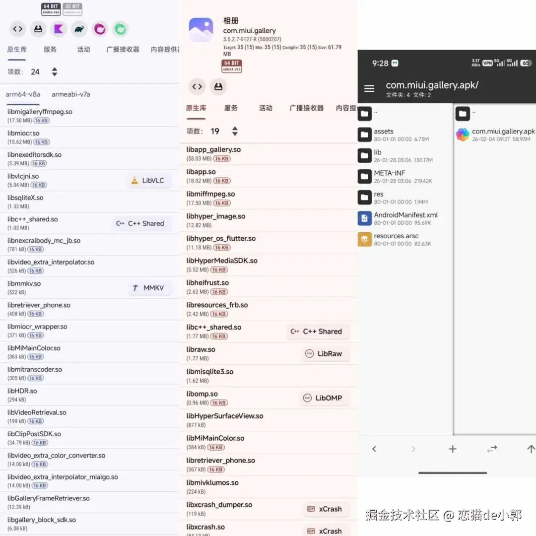 其实对比新旧的相册应用也可以看出来,图一是 4.x 版本, 而图而是 5.0-R 的版本,新版本在 libchecker 下已经看不到相应的 Kotlin 信息了,甚至没有了对应的 dex 目录,只有原生动态库 :