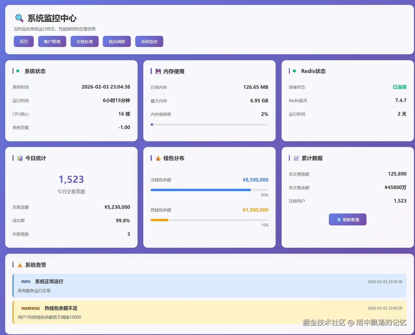 - 部分前端页面展示:钱包调拨、系统监控中心、交易处理、、账户管理等