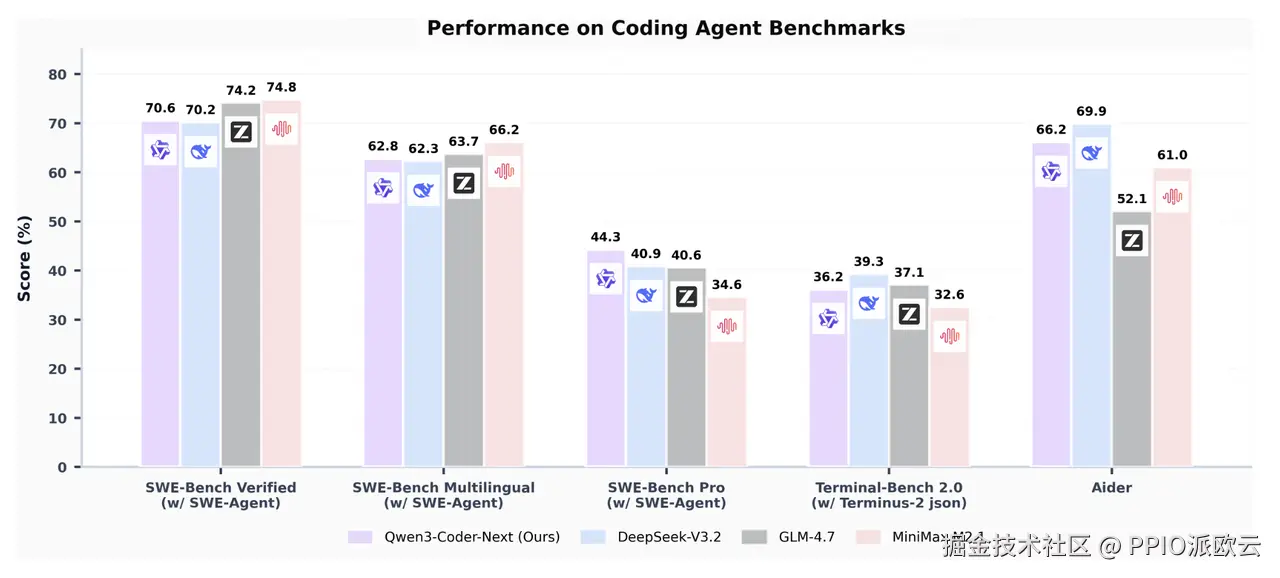 这种训练配方特别强化了三个核心能力:长程推理能力使模型能够处理复杂的多步骤编程任务,高级工具使用能力让模型熟练操作各种开发工具和API,以及故障恢复能力使模型能够从执行错误中学习并自动修正。这些特性确保了Qwen3-Coder-Next 在现实编程环境中具备强大的智能体表现。