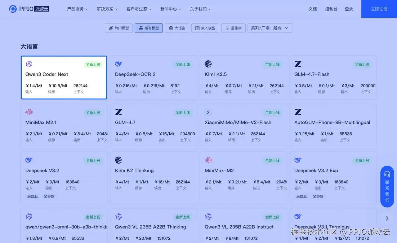 **开发者可以直接在 PPIO 官网体验 Qwen3-coder-next 或者调用其模型 API 。**PPIO 的模型服务平台,目前已经上线了上百款国内主流的开源模型,覆盖了文本、图像、视频等多模态模型,开发者只需要一两行代码就可以直接调用来搭建 AI 应用。