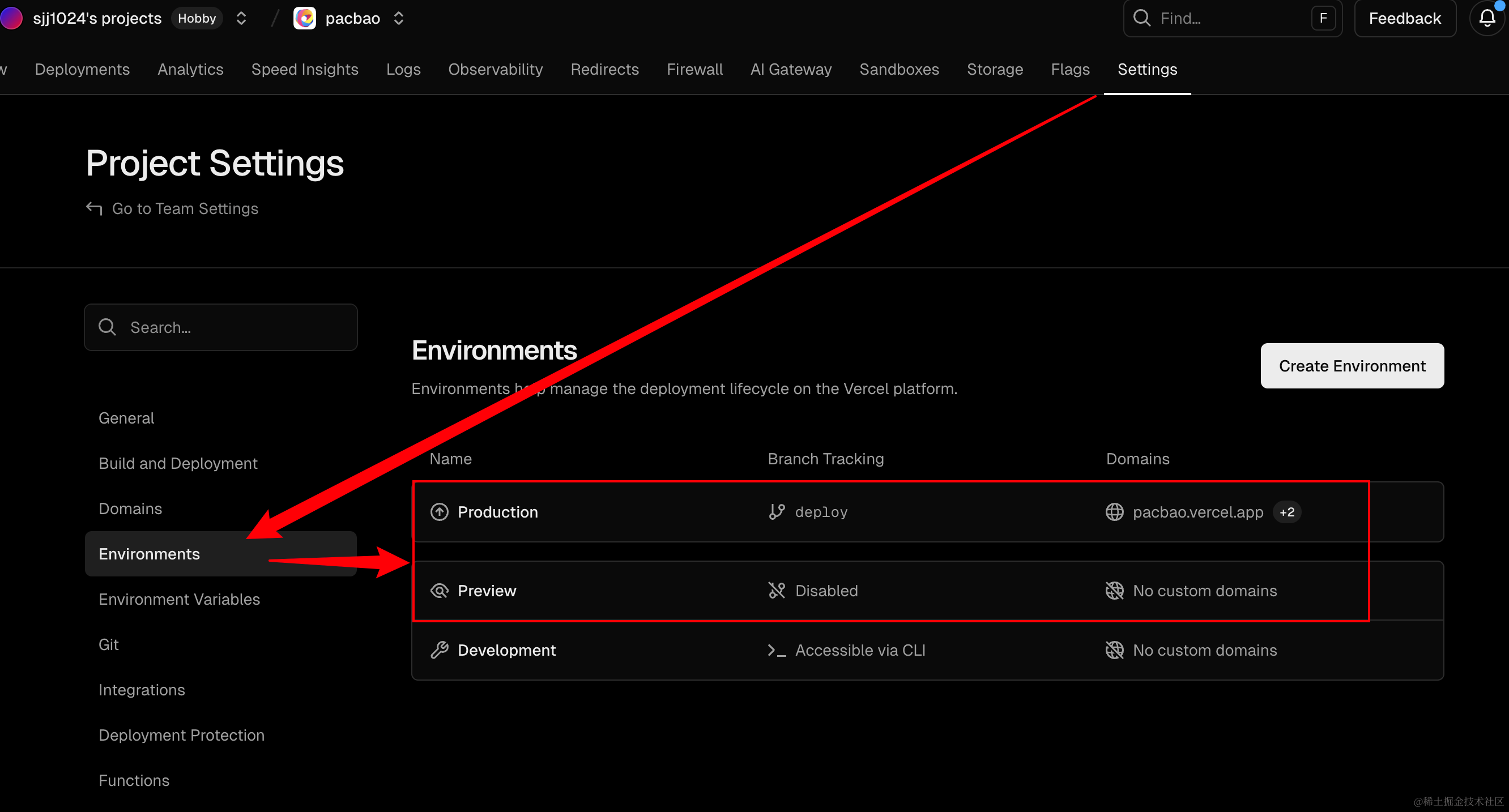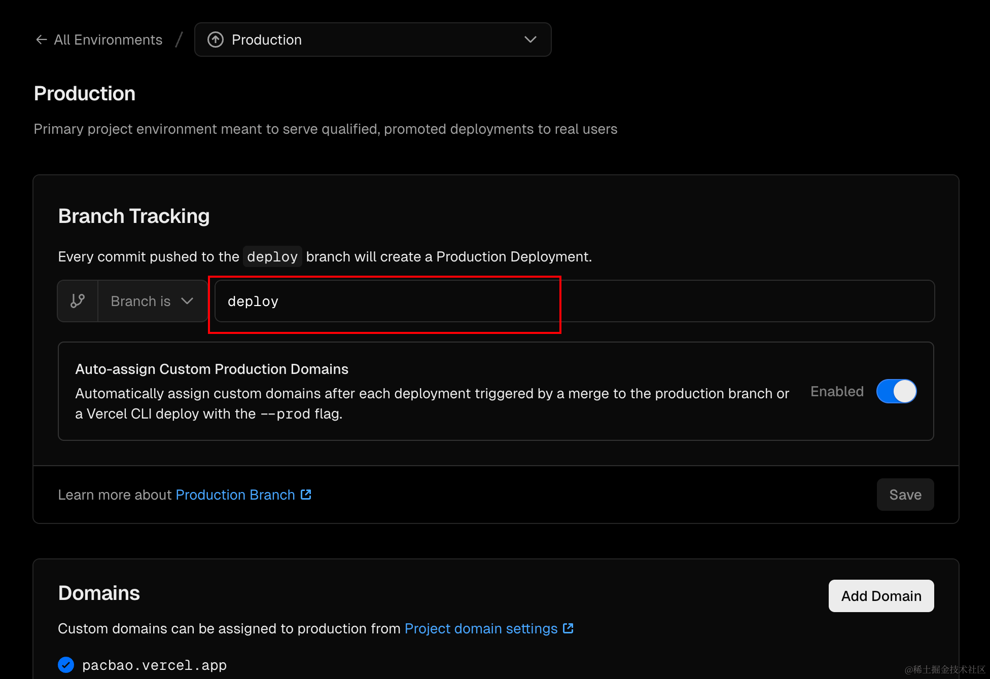 vercel项目在设置里面,有一个环境,里面有环境配置,比如Production是生产分支,点击这个Production,就会进入生产分支配置的页面