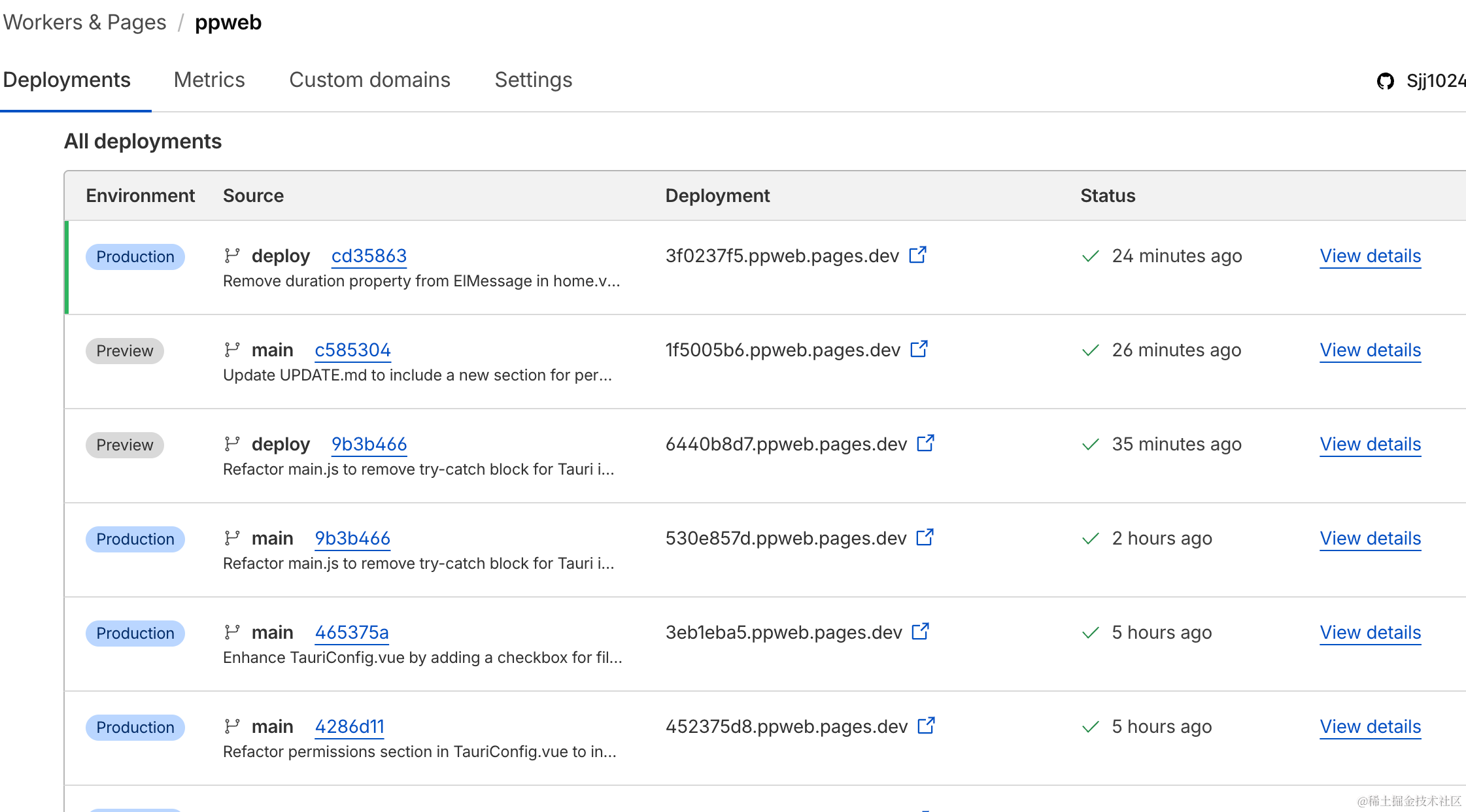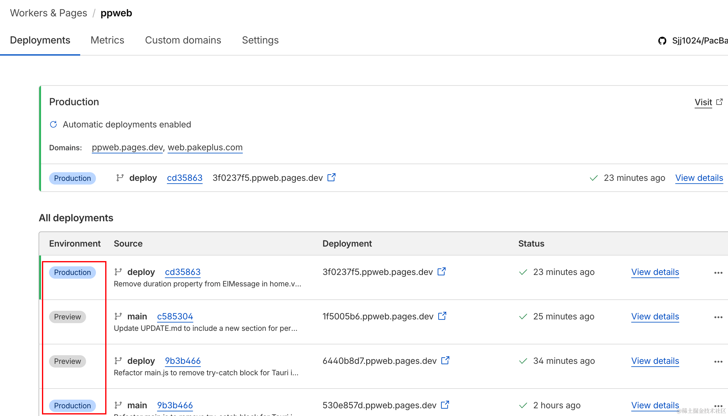 可以看到预览和生产环境的部署情况和地址: