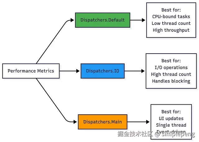 Dispatchers.Default 用于 CPU 密集型工作 - Dispatchers.IO for blocking I/O operations