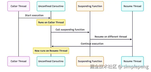 Unconfined 调度器在调用线程启动协程的执行,但仅持续到第一个挂起点。挂起后,它会在挂起函数恢复时所使用的线程上继续执行。