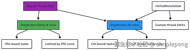 实现细节的一个关键点是 Dispatchers.Default 和 Dispatchers.IO 为了效率而共享线程。
