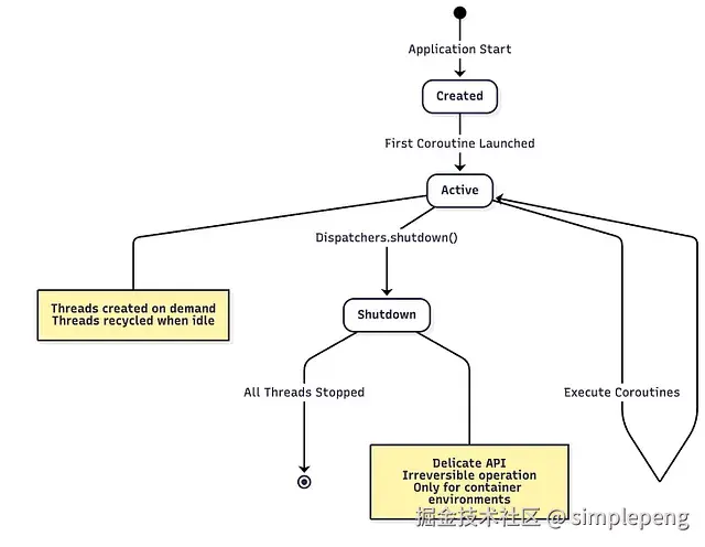 Dispatchers.shutdown() 函数是一个非常敏感的 API,它会停止所有内置的调度器: