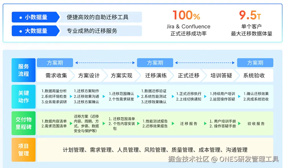 ONES 作为国内领先的企业级研发管理平台,凭借功能对标、自主可控、安全合规、高性价比与本地化服务等核心优势,已成为众多央国企及行业头部企业替换 Jira 和 Confluence 的首选。积累 6 年迁移经验,ONES 帮助超过百余家客户完成数据的平滑迁移,单个客户最大迁移数据体量超过 9.5 TB,正式迁移成功率达 100%。