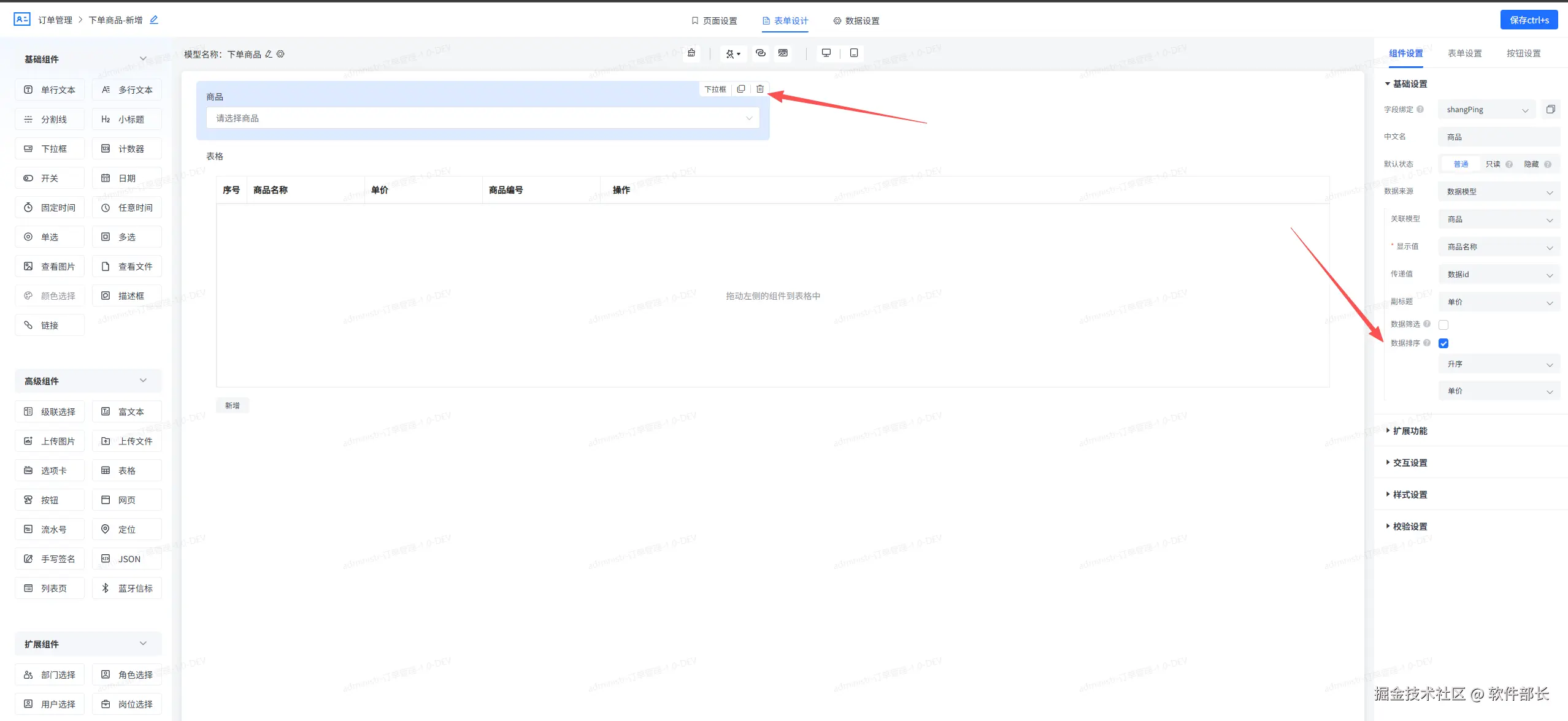 2、当表格绑定数据模型后,新增对回显数据的排序配置功能。您现可根据业务需求,为回显数据指定排序字段,并设置升序或降序排列。