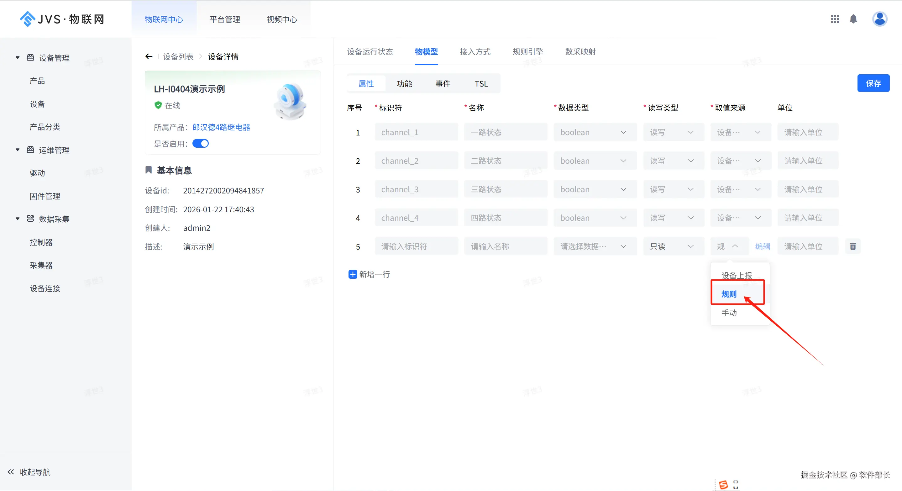 4、在设备的属性配置过程中,除了数据通过设备正常上报,属性还支持通过公式加工对数据进行转换