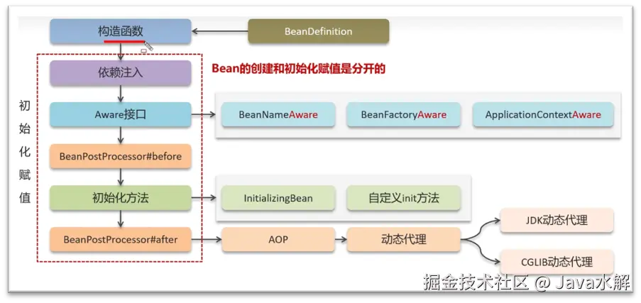 (3)初始化:Spring容器为每个Bean调用初始化方法,比如Aware接口回调、前置处理等;