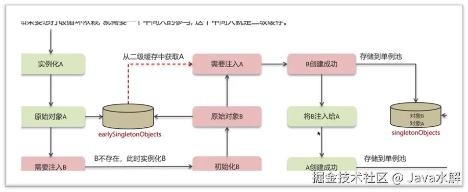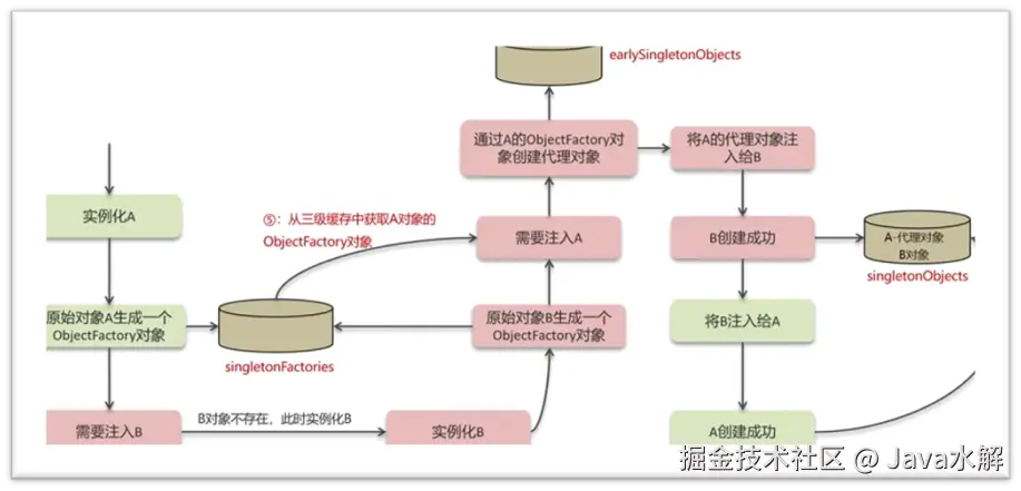 创建A实例,将对象A生成ObjectFactory对象放入到三级缓存中,接着注入B,发现B不存在,实例化B,B也生成ObjectFactory对象放入三级缓存,B从三级缓存中获取A对象工厂创建的代理对象,代理对象放入二级缓存中,将A的代理对象注入给B,B创建成功放入单例池,最后将B注入给A,A也创建成功放入单例池;