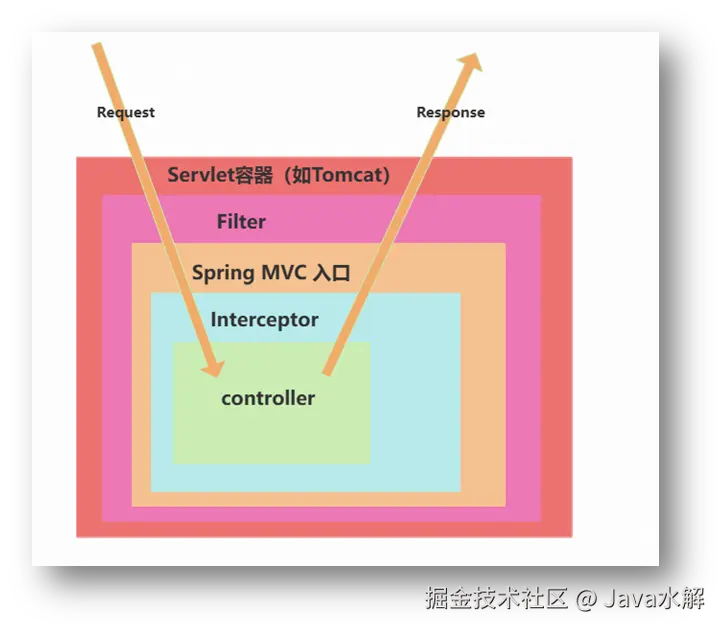 (2)过滤器在拦截器之前执行,可以处理所有的请求;而拦截器只能处理SpingMVC的Controller请求;