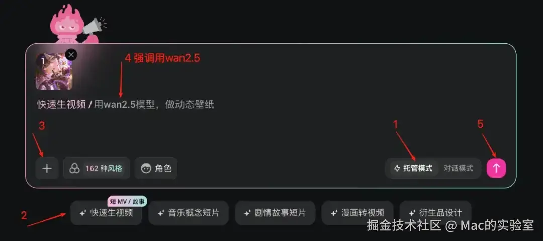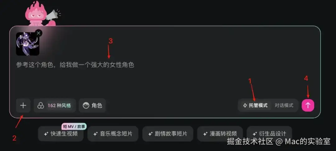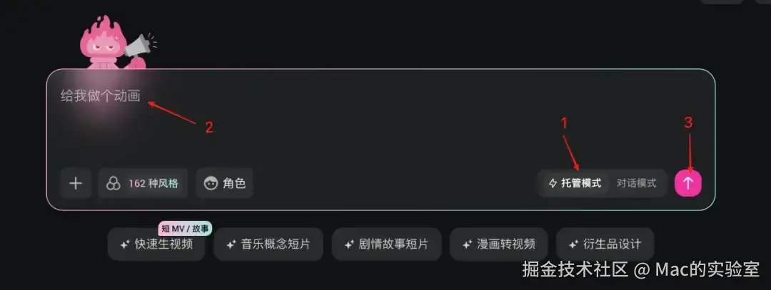 默认选择托管模式,输入任意指令(也可上传张图),点击开始即可。