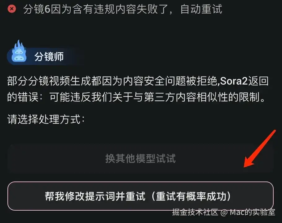 如遇到分镜生成失败,请点击【帮我修改提示词并重试】!如下图: