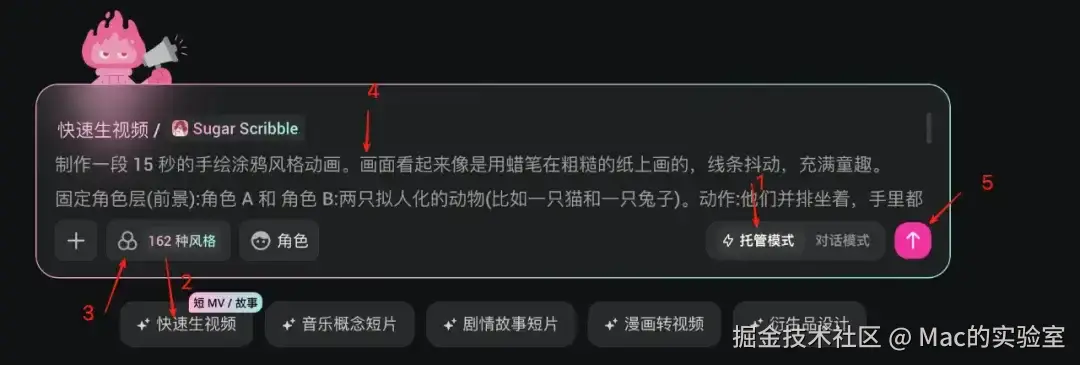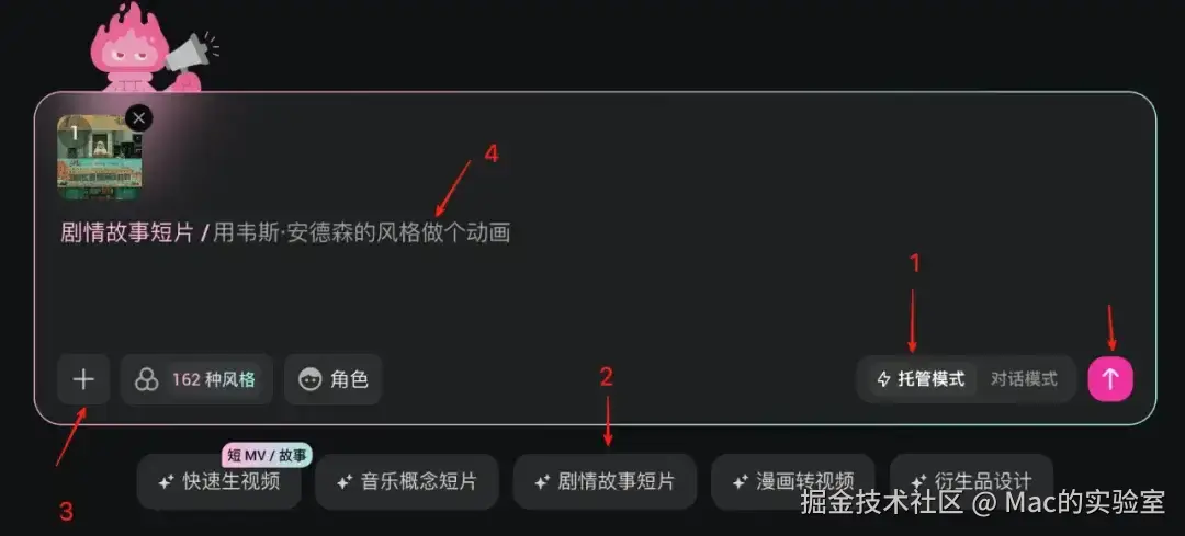 如果我们要做动画视频,可以选择里面的“剧情故事短片”,在里面输入剧本或者想要改编的小说片段,选择托管模式,点击“对话模式”旁边的箭头,就会进入到自动制作的流程。