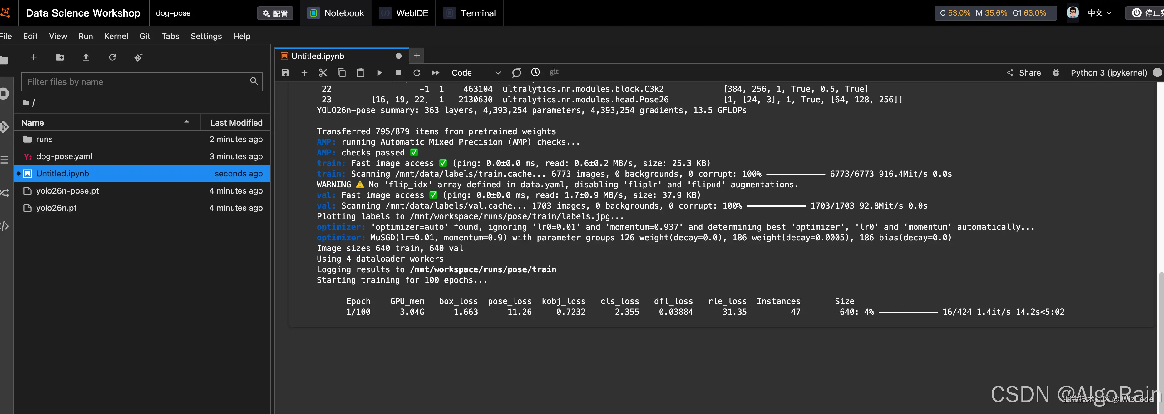 yolo26n-pose模型可以直接识别人体姿势,但不识别其他动作或物体,如果想精准识别其他分类,需要自己重新训练,本来想做小狗的姿势分析,发现在ultralytics中提供了全量的dog-pose数据集,包含6,773张训练图像和1,703张测试图像,官网教程写了使用数据集方式,但没有提供训练好的模型,这里有我训练好的,训练集较大本地CPU训练不出来,特意使用阿里云GPU服务器训练了6个小时(服务器每小时12元),一共花费70元,可以直接下载使用,也可以看后续教程,但确实训练一次成本太高,没必要实践。